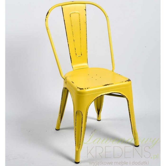 Żółte jak kanarek krzesła industrialne, w całości metalowe, z urzekająco postarzaną powierzchnią. Zadrapania i przetarcia widać zarówno na nogach, siedzisku i oparciu, dzięki czemu otrzymujemy spójny stylistycznie mebel. No i przede wszystkim krzesło Belldeco jest super wygodne i oryginalne wizualnie!