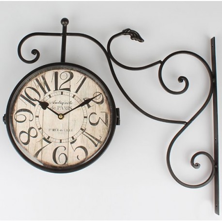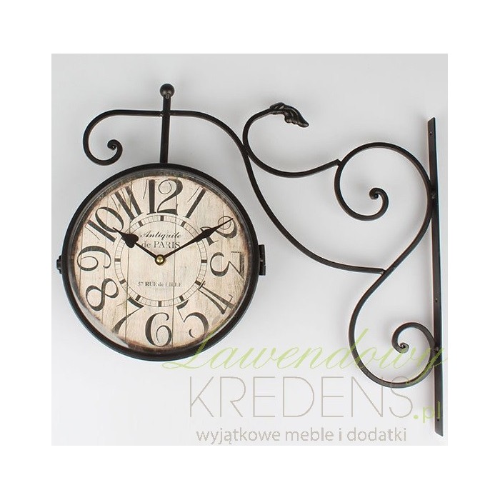 Francuski zegar dwustronny w czarnej, metalowej osłonie, wiszący na fantastycznej, dekoracyjnej poręczy!