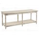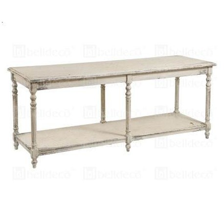 Długi stół Belldeco z półką w stylu prowansalskim, pochodzący z przepięknej serii mebli Luna wykonany jest z drewna jodłowego oraz płyty MDF. Jest stołem idealnym dla osób lubiących styl prowansalski, ponieważ ma jasny kolor, a jego powierzchnia jest stylowo postarzana poprzez nieregularne przecierki. Nogi stolików Luna są elegancko rzeźbione.