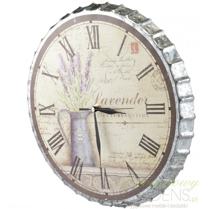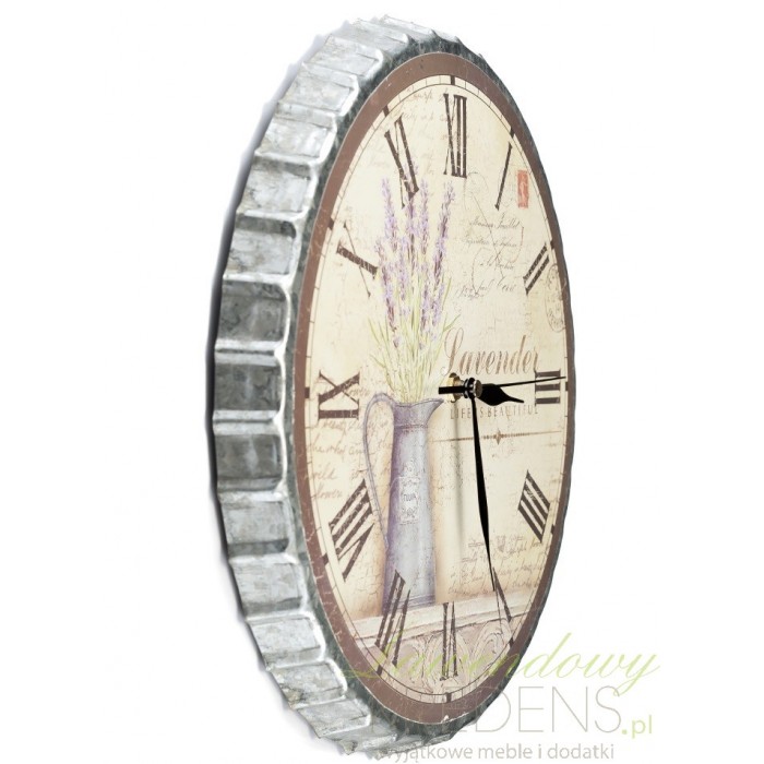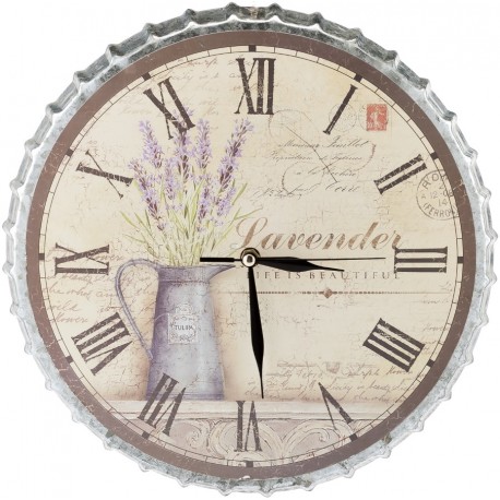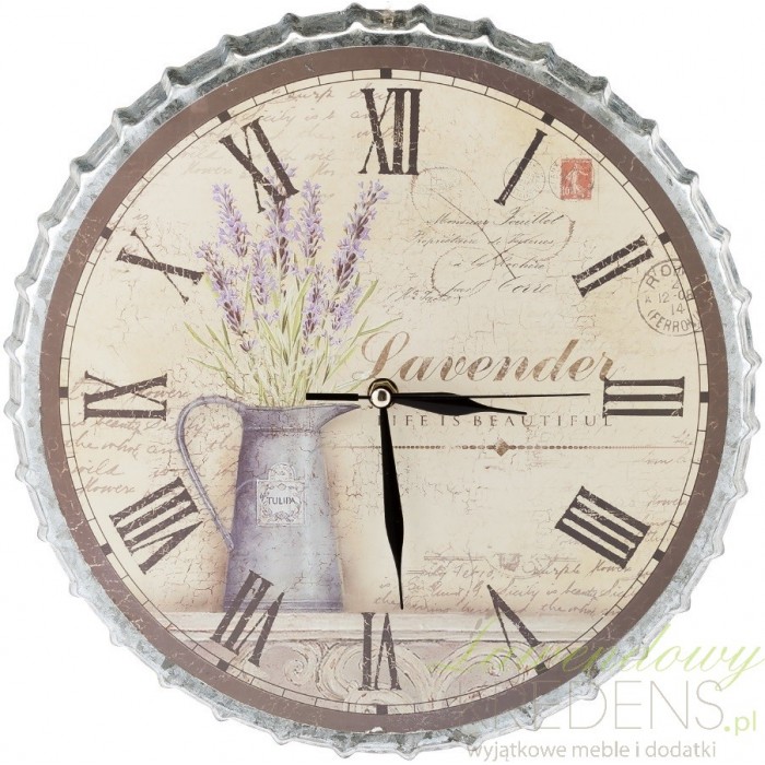 Metalowy zegar w stylu prowansalskim z nadrukowaną tarczą w jasnych, przyjemnych dla oka barwach, które doskonale odbijają na swoim tle czarne wskazówki. W centralnej części tarczy widzimy blaszany dzbanek z kwitnącą lawendą wśród napisów w języku francuskim! Cały zegar ma kształt kapsla od butelki!