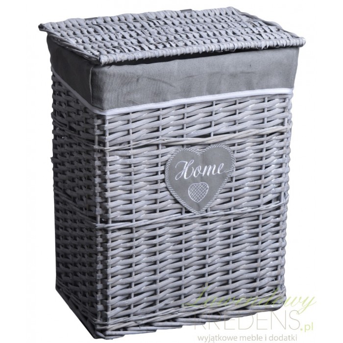 Wiklinowy kosz na bieliznę w całości w odcieniu szarości, z uroczym serduszkiem z napisem HOME. Prawdziwie stylowy!