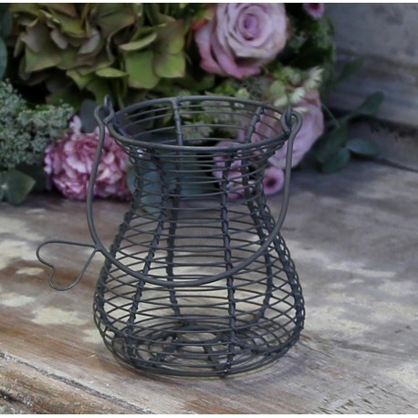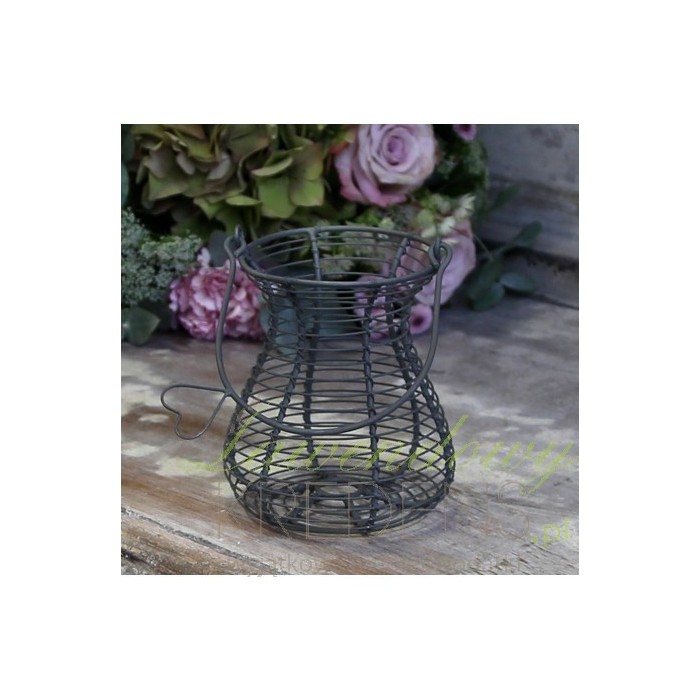 Wykonany z różnych grubości prętów metalowych koszyk w kształcie wazonu na kwiaty, który na dużej rączke ma dodatkowo przymocowane metalowe serduszko. Takie dodatki prowansalskie to świetny pomysł na ułożenie bukietu sztucznych kwiatów czy przechowywanie ulubionych dziecięcych rysunków!