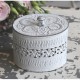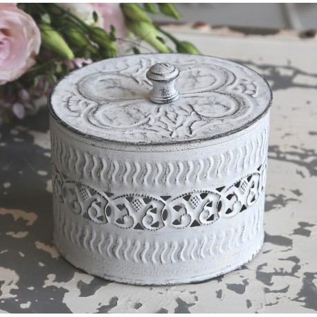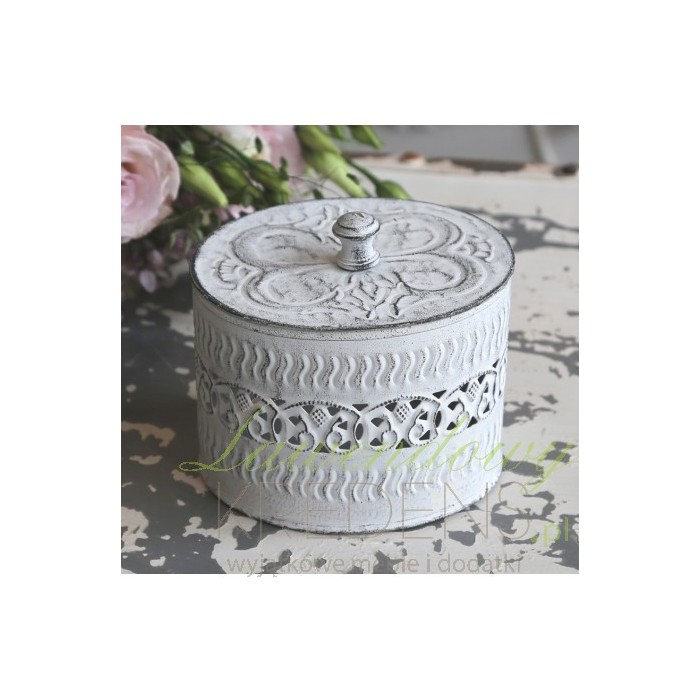 Zachwycająco ozdobny, metalowy pojemnik o białej, postarzanej powierzchni z płaską, również metalową pokrywką!