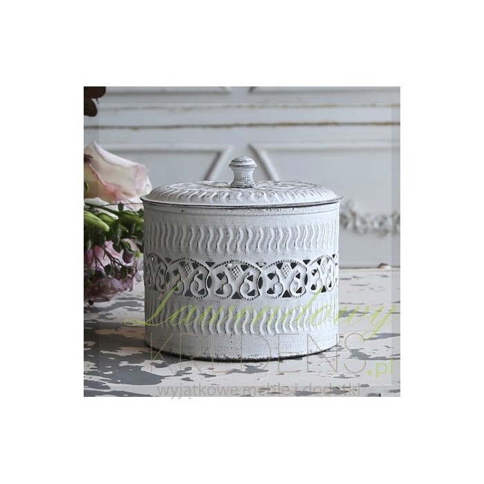 Postarzany na białej powierzchni, metalowy pojemnik wielofunkcyjny, który dekoracyjnie wejdzie na Twoje półki czy to w kuchni czy w salonie. Prowansalski charakter pojemnika zapewniają mu bajkowe wypukłości i wycięcia, układające się w niepowtarzalny wzór na całej powierzchni bocznej i łatwej do zdjęcia pokrywce!