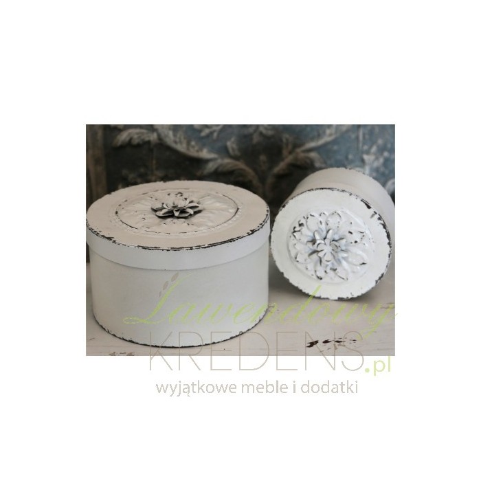 Na kremowo pomalowany, metalowy pojemnik Chci Antique z cudownie ozdobioną pokrywką z trójwymiarowym kwiatem!