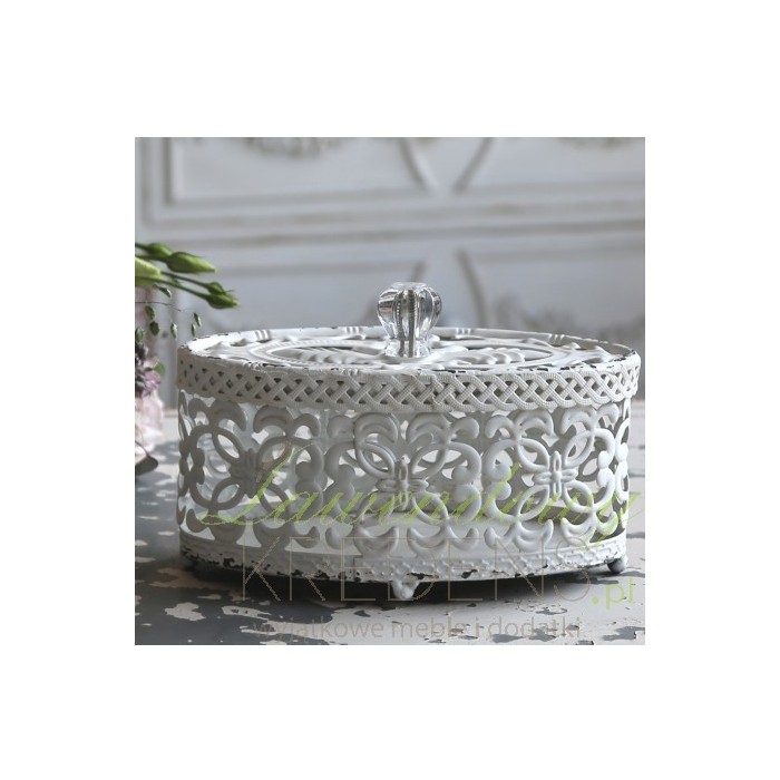 Zjawiskowy, metalowy pojemnik z wykonanym z kryształu uchwytem na pokrywce. W całości ażurowany!