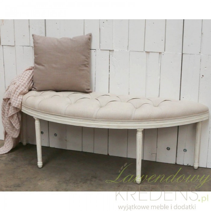 Półkoliście zakończona ława tapicerowana od Chic Antique, która może stać zarówno samodzielnie jak i przystawiona do ściany, która w tym wypadku staje się jej naturalnym oparciem. Taki prowansalski mebel dodaje wnętrzu swobody i świeżości, a jednocześnie może stać się miejscem błogiego odpoczynku!