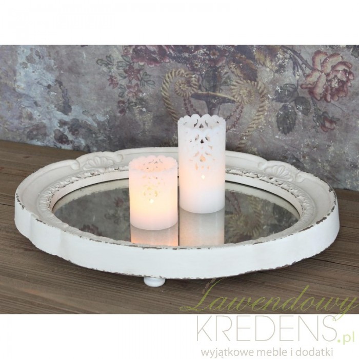 Duża, eliptyczna taca w stylu prowansalskim, której denko wykonane zostało z najprawdziwszego lustra! W dodatku ta rama!