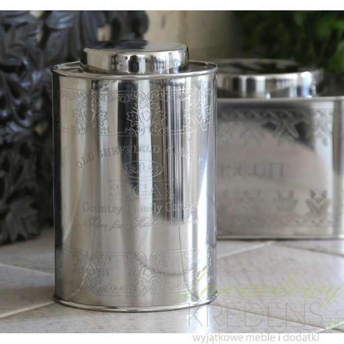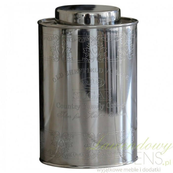 Metalowa puszka na cukier o błyszczącej powierzchni, na któej widoczne są delikatne grawerunki z angielskimi napisami i dekoracyjnymi ornamentami. Już nie musisz chować cukru do szafki - taki pojemnik świetnie będzie prezentował się na głównym blacie, dodatkowo zabezpieczając zawartośc przed wilgocią i kurzem!