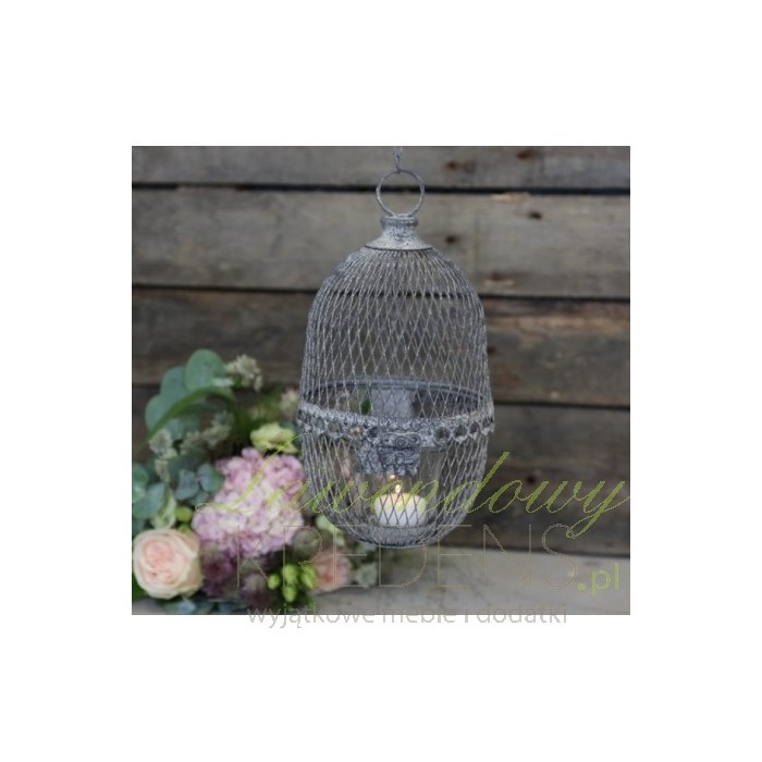 Przypominający kształtem podłużną klatkę dla ptaszka, lampion metalowy w stylu prowansalskim, na świece typu tea light!