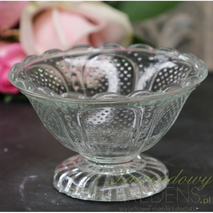 Miseczka na nóżce od marki Chic Antique wykonana została ze szkła o interesującej fakturze z drobnymi wypukłościami.