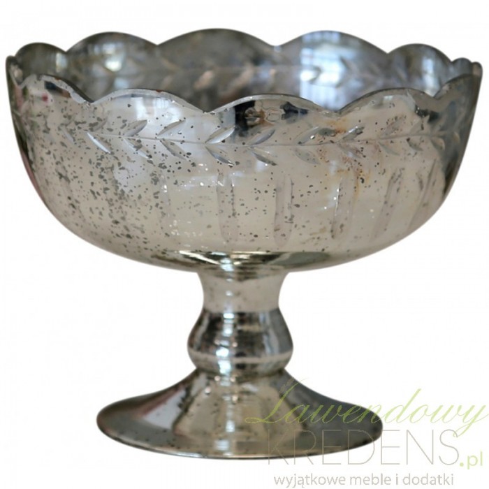 Misa na nóżce z kolekcji Silver Chic stanowi cudowną prowansalską dekorację wnętrza. Srebrny kielich firmy Chic Antique jest szeroki i ma falistą krawędz. U góry posiada zdobienia w postaci delikatnych listków. Będzie niesamowicie wyglądał na komodzie czy stole.