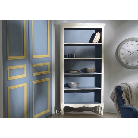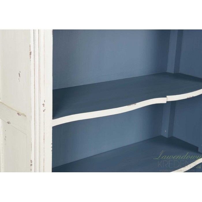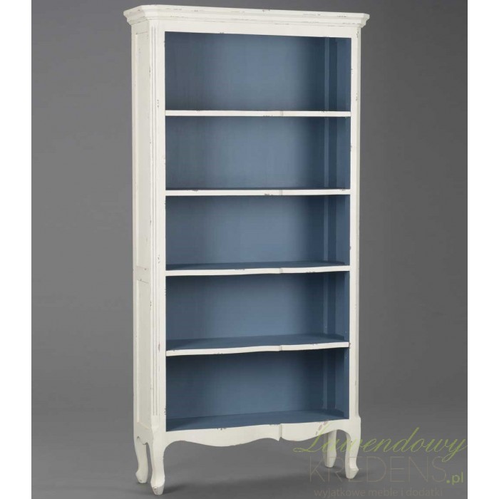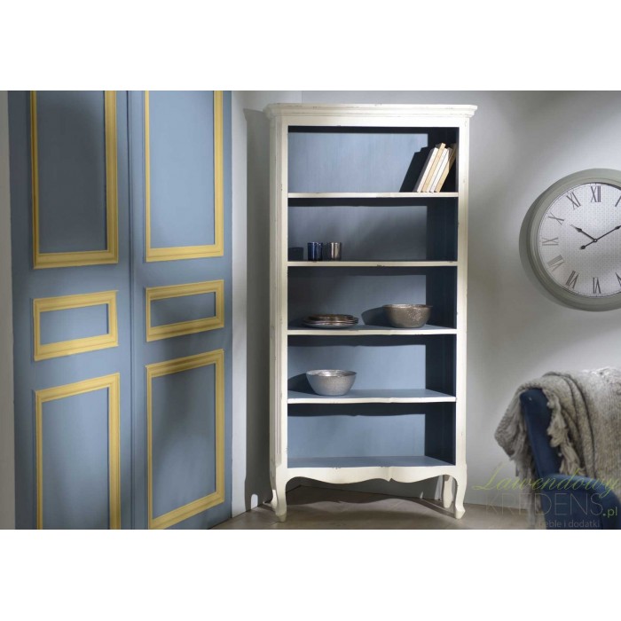 Meble w stylu prowansalskim to doskonały pomysł na odświeżenie swojego mieszkania. Postarzane meble to świetne rozwiązanie dla osób, które preferują stary i niepowtarzalny styl. Regał prowansalski z kolekcji Neli jest w kolorze kremowym z przetarciami farby. Wnętrze regału jest w barwach niebieskich co stanowi piękny kontrast i stwarza atmosferę ciepła domoweg ogniska. Regał pochodzenia francuskiego ma pięć dużych półek z charakterystyczną miękką linią i fikuśne zdobienia na dole.