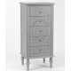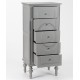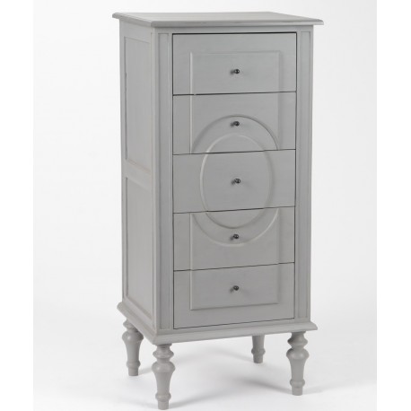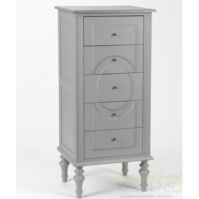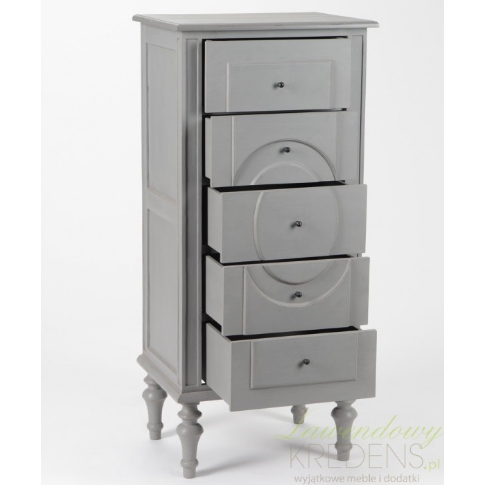 Szara, wąska komoda prowansalska z kolekcji Assi ze ślicznymi krótkimi nóżkami i owalnym wzorem na szufladach!