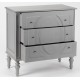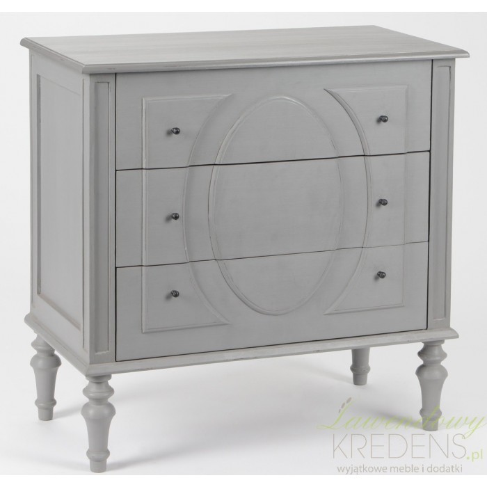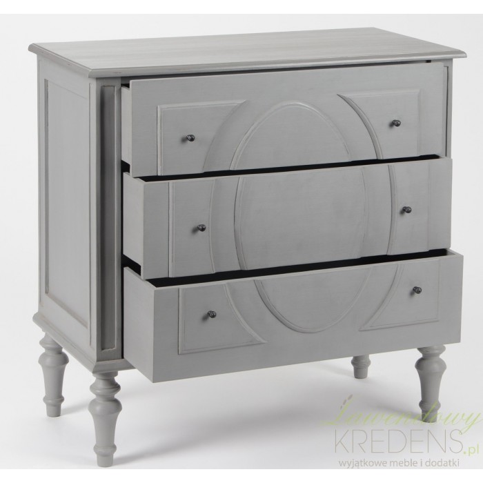 Szara komoda prowansalska z kolekcji Assi z trzema dużymi szufladami i owalnym motywem!