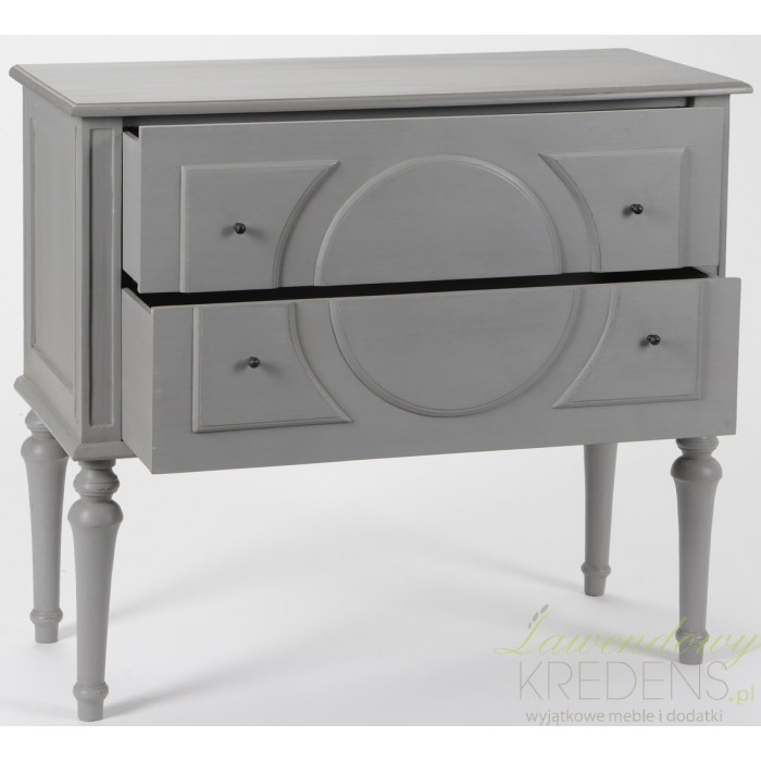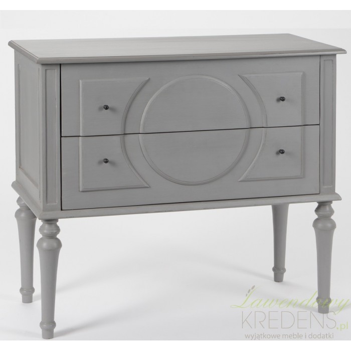 Elegancka komoda prowansalska wykonana jest z drewna i płyty MDF. Szara komoda Assi posiada pięknie rzeźbione nogi i dwie szerokie szuflady na bieliznę czy biżuterię. Wyróżnia ją duży wzór koła, który stanowi przyjemny element dekoracyjny mebla. Meble prowansalskie ślicznie wyglądają w połączeniach tej samej serii. Polecamy!