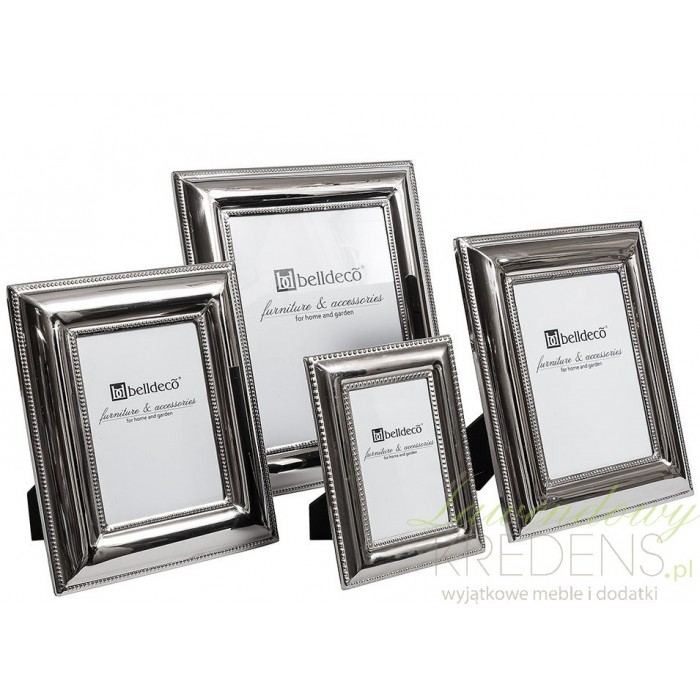 Ramka Belldeco ma srebrny kolor i błyszczy. Naokoło niej znajdują się delikatne wypukłe koraliki, będące jej wspaniałą ozdobą. Srebrna ramka wykonana jest z dobrej klasy aluminium i szkła. Ramki na zdjęcia mogą być pojedyncze lub stanowić jedną całość.