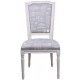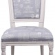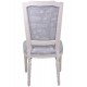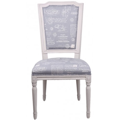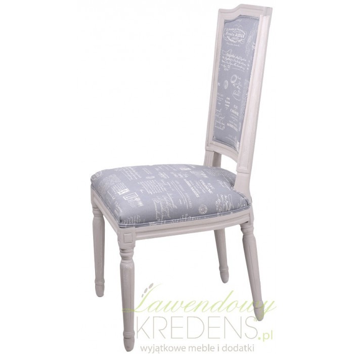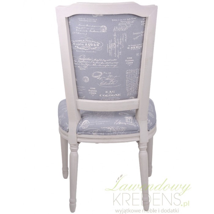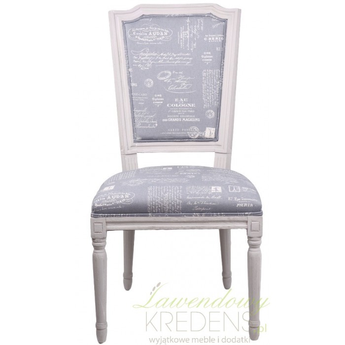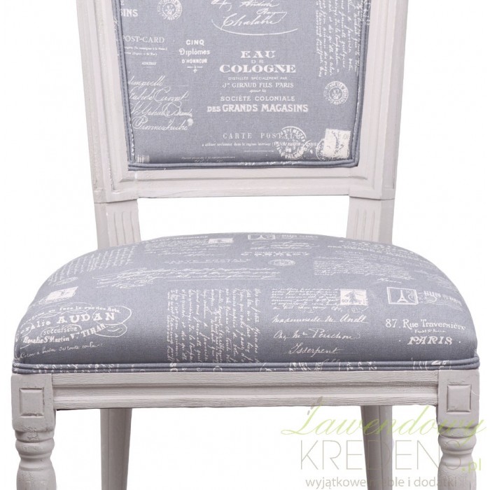 Szare krzesło prowansalskie pokryte tapicerką z napisami francuskimi to mebel jakiego nie spotkasz w żadnym innym wnętrzu. Dzięki wykorzystaniu jasnych kolorów szarości i beżu będzie doskonale pasowało w połączeniu z różnego koloru stołami. Krzesło zostało zrobione z drewna topoli, wyrzeźbione prostymi wzorami i delikatnie przetarte na krawędziach. Meble w stylu prowansalskim takie jak krzesła tapicerowane to solidne meble, które nigdy Ci się nie znudzą!