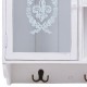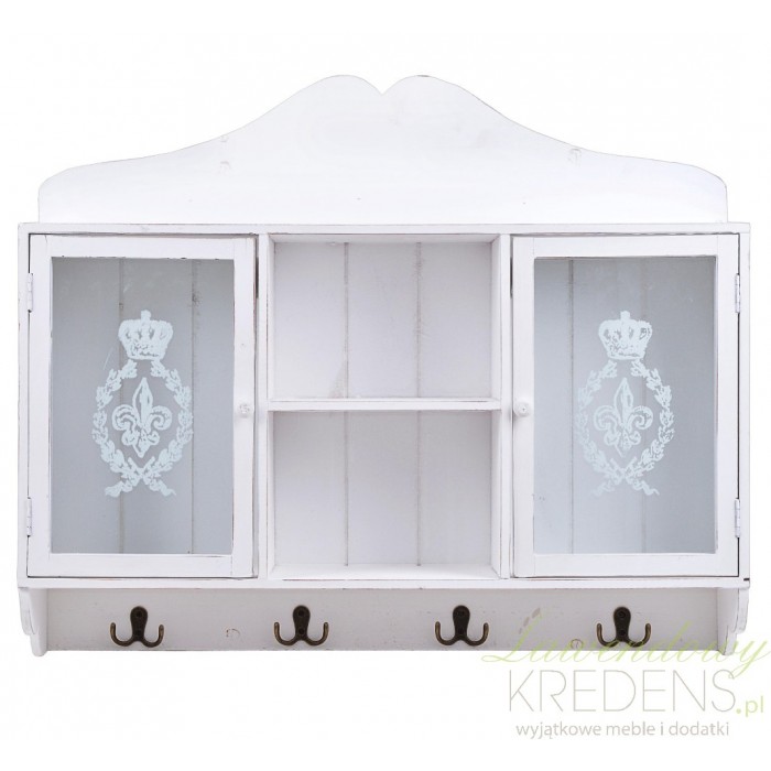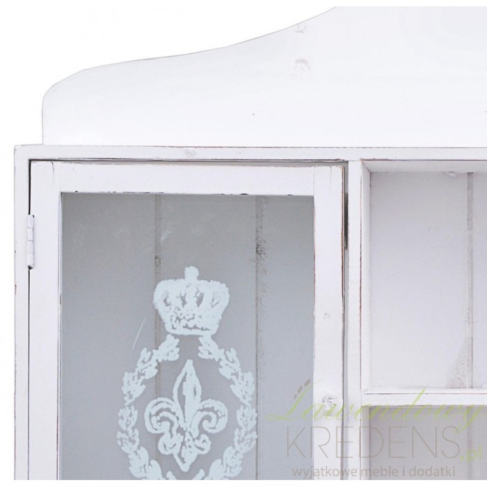 Szafka ścienna w prowansaslkim stylu niczym szafka ze starego, wiejskiego domu. Szafka jest stylizowana na starą poprzez przetarcia i odpryski farby. Obydwie szybki szafki są ozdobione białym wzorem z lilijką otoczoną wieńcem i udekorowaną koroną. W dolnej części szafka posiada cztery praktyczne, podwójne wieszaki z metalu.