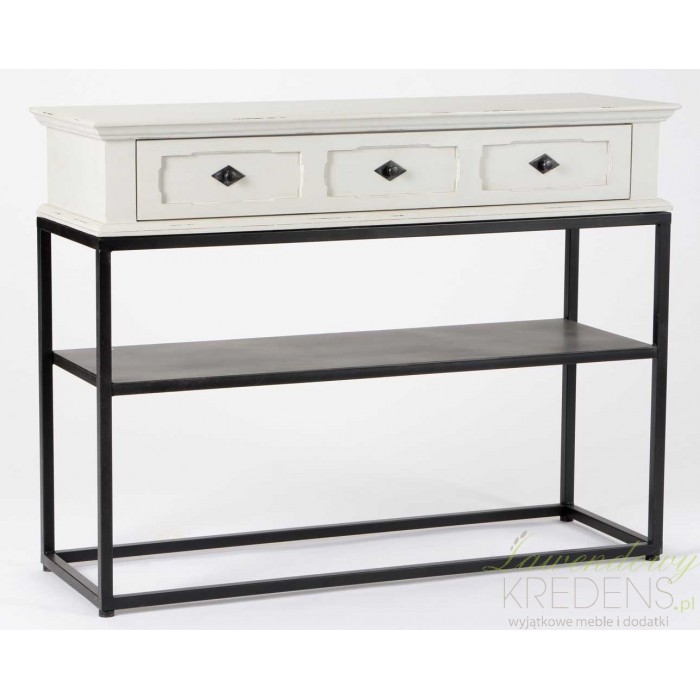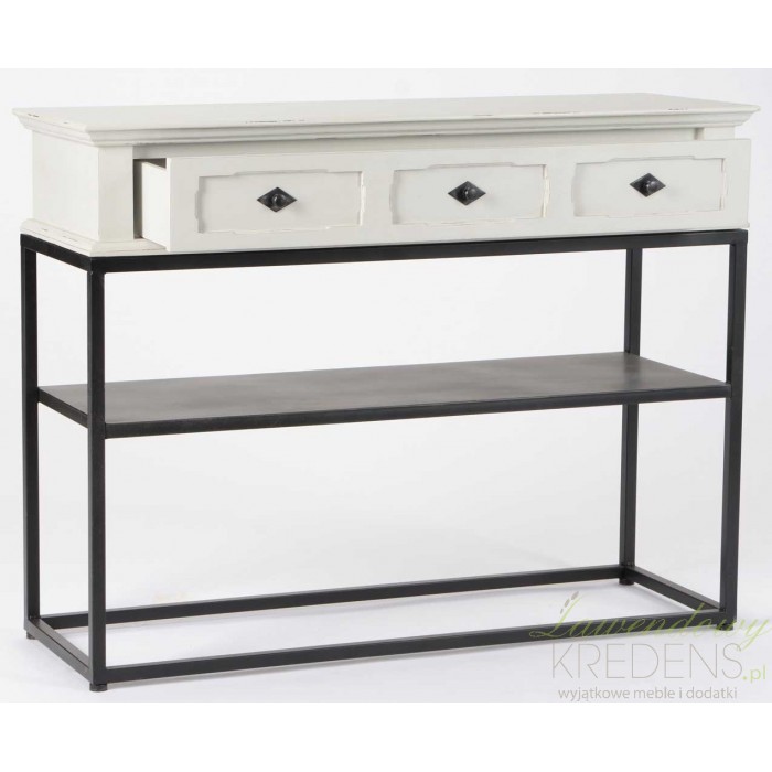 Konsola prowansalska z jasnoszarą częścią z trzema szufladami oraz metalową czarną podstawą gdzie znaleźć można półkę. Meble prowansalskie od francuskiego producenta to modne i funkcjonalne przedmioty. Konsola z szufladami odnajdzie się w salonach, gabinetach lub przedpokojach.