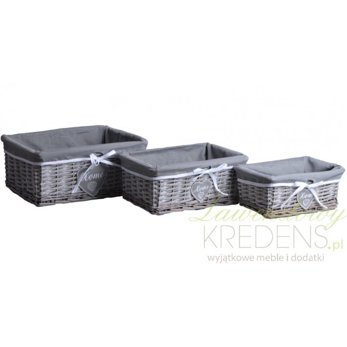 Kosze wiklinowe to wspaniałe dodatki do łazienki czy pokoju, w których pomieści się wiele wartościowych rzeczy. Ten niewielki wiklinowy kosz jest koloru szarego i wyłożony materiałem wykonanym z bawełny. Ozdobiony jest białą, delikatną kokardką, a na przodzie naklejona jest szara materiałowa dekoracja w kształcie serca z napisem Home. Kosze wyglądają przepięknie jako urocze dodatki do łazienki.