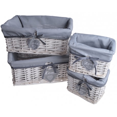 Kosz wiklinowy, którego wypełnieniem jest szary materiał to dodatek, który pomoże utrzymać porządek w łazience. Wiklinowy kosz w białym kolorze oraz ozdobnym szarym serduszkiem z napisem home.