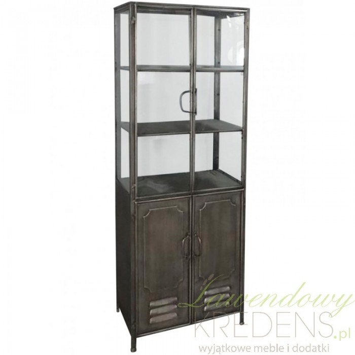 Prosta w budowie, ale zjawoskowo prezentująca się witryna industrialna z charakterystycznymi dla tego stylu zdobieniami powierzchni drzwiczek,na których widzimy proste klamki i charakterystyczne wywietrzniki. Z czterech stron przeszklone górne półki świetnie kontrastują ze szczelną zabudową dołu!