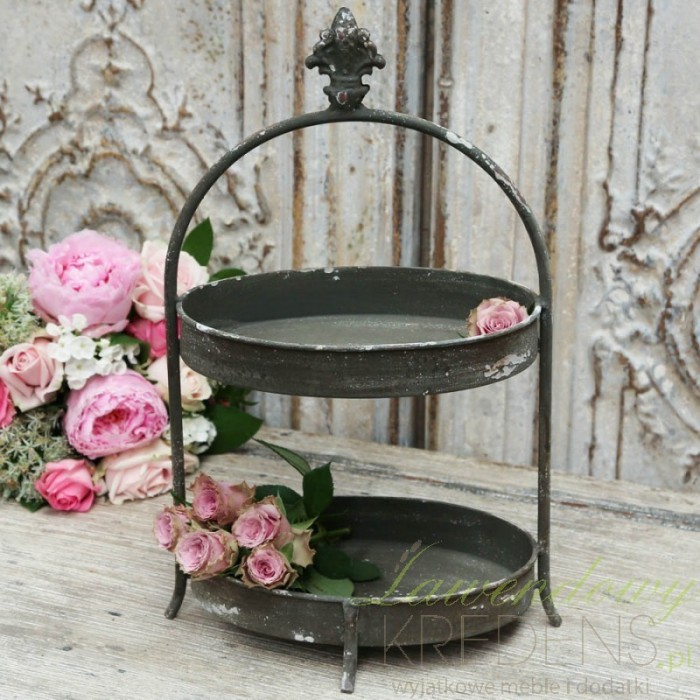 Wyjątkowa etażerka prowansalska ze śladami zadrapań i otarć farby na powierzchni, które stylowo podkreślać mają charakter tego pięknego dodatku do kuchni. Dwie oddzielne tacki pozwalają na łączenie różnych smaków na jednym stole, a także na większy wybór smakołyków!