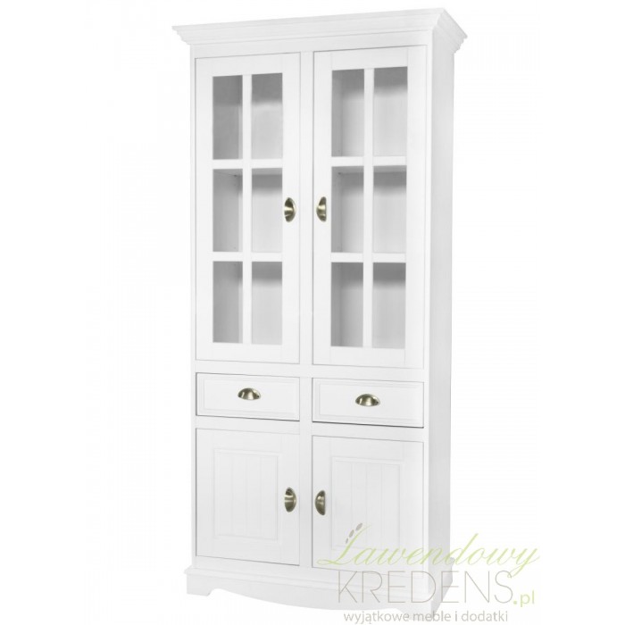 Prowansalska, biała witryna w formie kredensu, z licznymi półkami, które z pewnością ułatwią Ci przechowywanie zastawy stołowej.