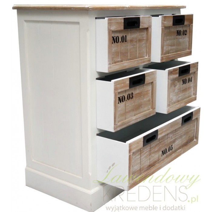 Meble w stylu prowansalskim to niezwykle pomysłowe dzieła wykonane z należytą starannością. Komody prowansalskie to przede wszystkim białe meble z różnymi, ozdobnymi dodatkami. Komoda prowansalska pochodzenia niemieckiego stworzona została z wysokiej jakości drewna w kolorze białym matowym, a jej blat i fronty szuflad w kolorze bielonego drewna . Z przodu szuflad widnieją ich numery -cztery szuflady mniejsze i jedna większa.