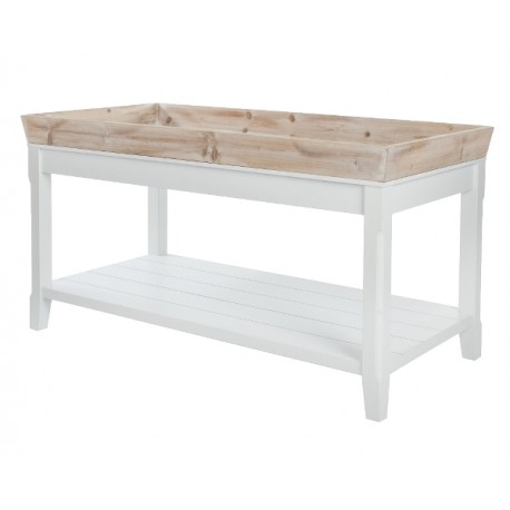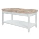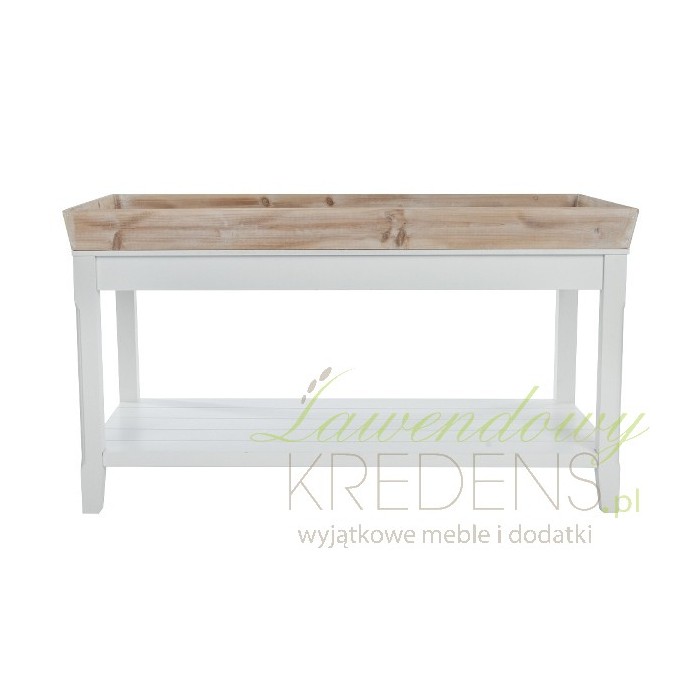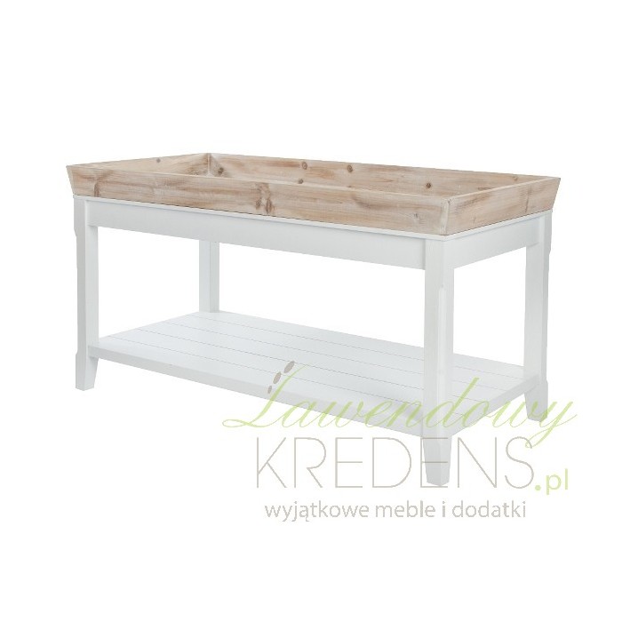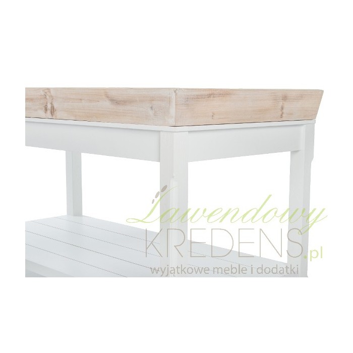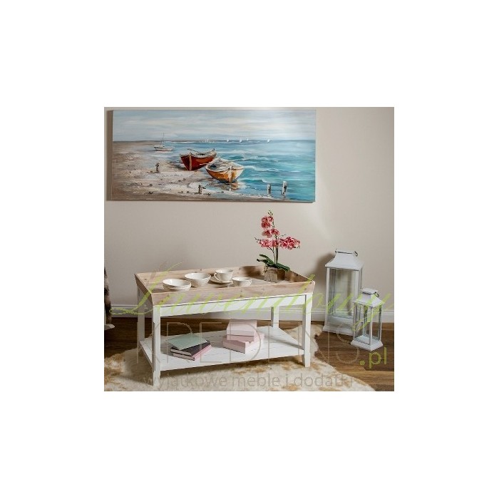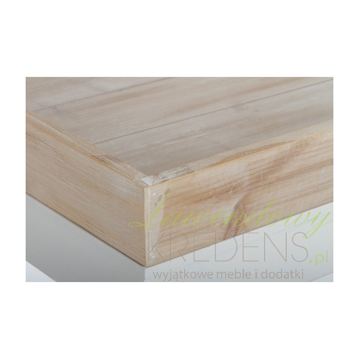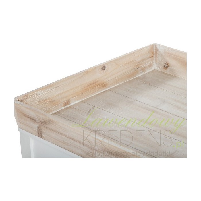 Niski stolik kawowy wykonany jest z solidnego drewna w kolorze białym matowym. Na blacie znajduje się duża drewniana i poręczna taca w kolorze bielonego drewna. Stolik prowansalski świetnie będzie prezentował się w salonie podczas spotkań przy filiżance pachnącej kawy czy herbaty. Meble w stylu prowansalskim zapewniają nam moc niezapomnianych wrażeń.