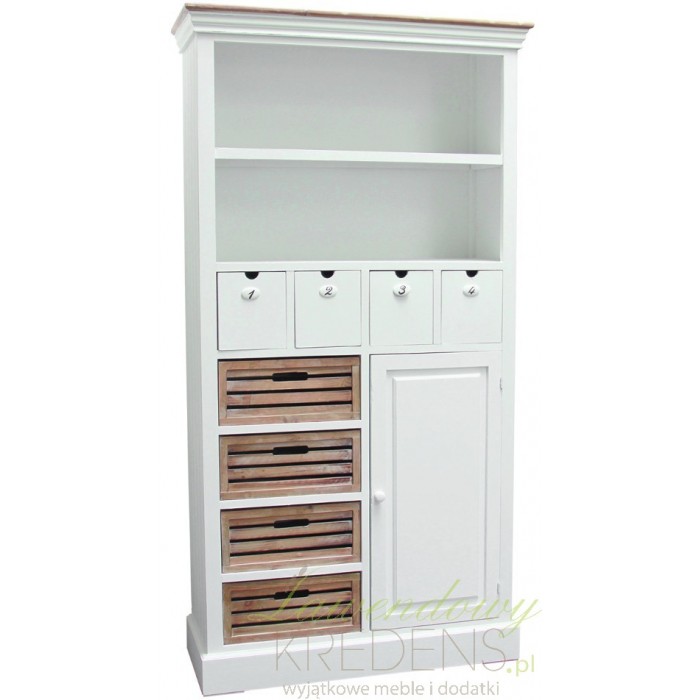 Regał w stylu prowansasalskim o bardzo ciekawym i zaskakującej linii. Oprócz typowych dla regałów i kredensów półek oraz drzwiczek regał prowansalski Riviera posiada cztery drewniane skrzynki wypełniające przestrzeń na półkach oraz cztery szufladki z białymi frontami ozdobionymi cyframi od 1 do 4. Tam oryginalny podział wnętrza regału sprawi, że mebel będzie tylko dekoracją wnętrza, ale także pozwoli odpowiednio posegregować chowane do regału przedmioty.