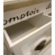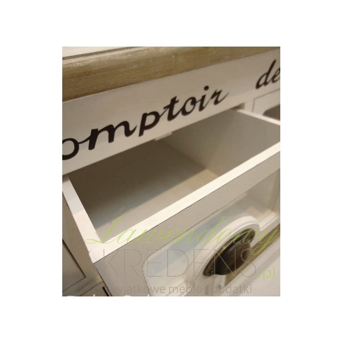 Biała komoda prowansalska z kolekcji Riviera z sześcioma szufladkami oraz z jedną szafką i ozdobnymi napisami.