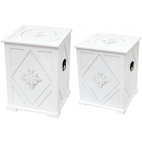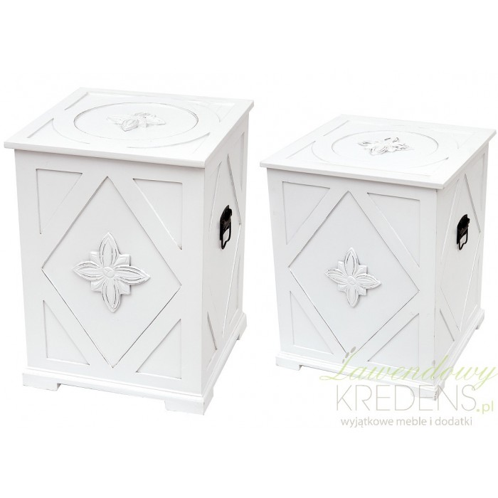 Dwie białe skrzynie prowansalskie z kolekcji Bianca w różnych rozmiarach, z pięknym rzeźbionym motywem kwiatowym!