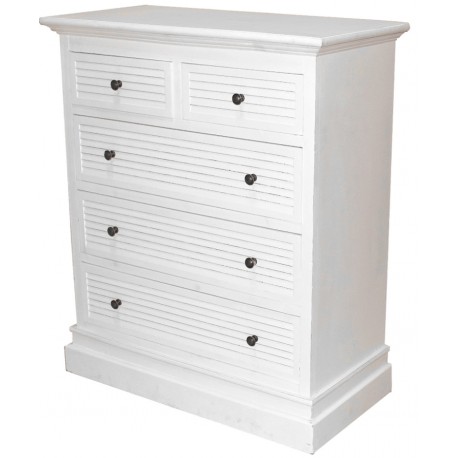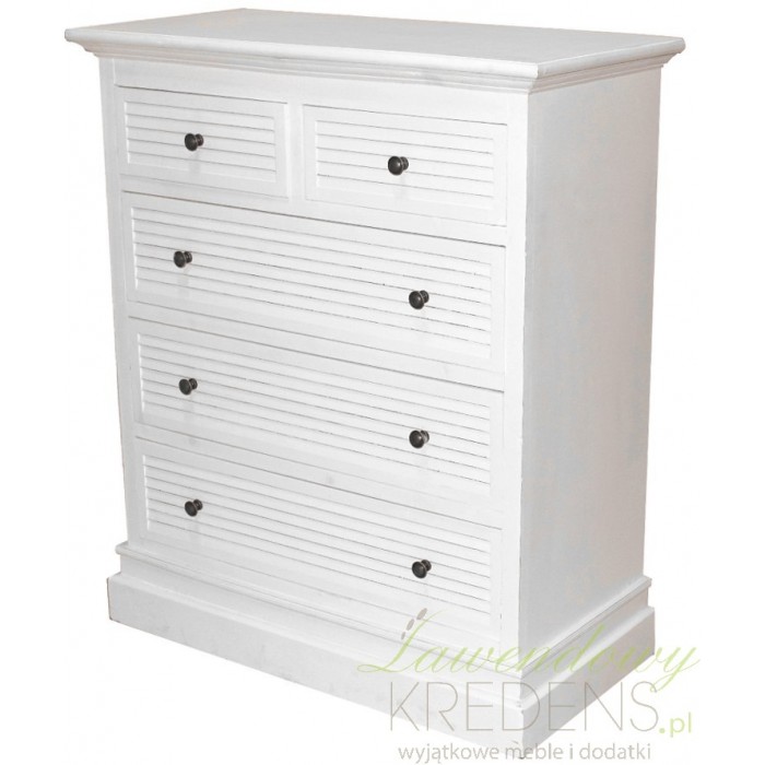 Komoda prowansalska jest w kolorze białym i zbudowana została na solidnej podstawie. Komoda w stylu prowansalskim z kolekcji Riviera to przepiękna dekoracja mieszkania. Posiada trzy duże dwie małe szuflady z poprzecznymi, ozdobnymi paskami na ich froncie. Dodatkową dekorację stanowią czarne, proste gałki do mebli, które nadają uroku i skromności. Meble prowansalskie odmienią twoje mieszkanie już dziś!