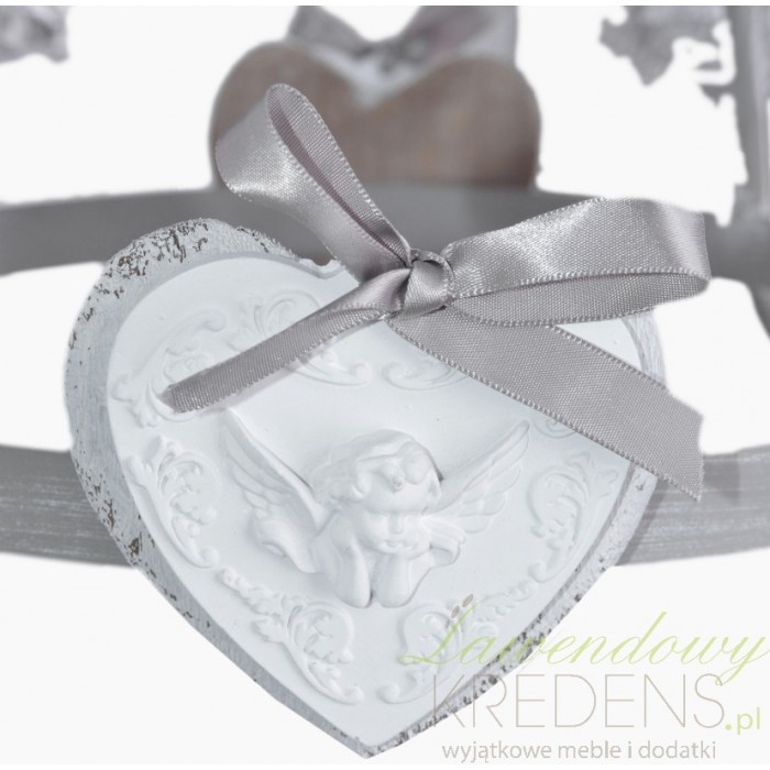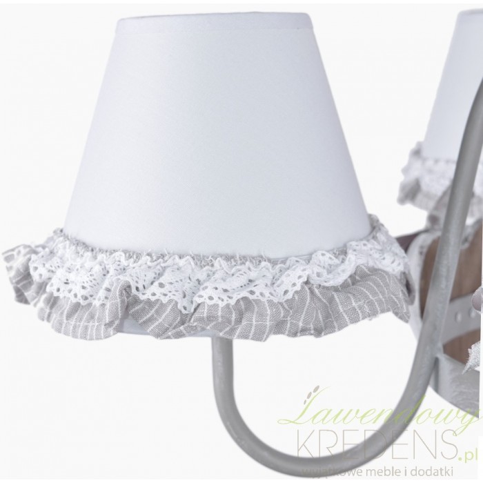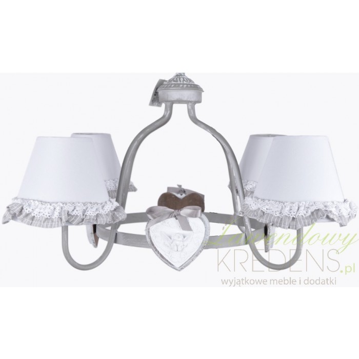 Oryginalnie wykonany, szary żyrandol prowansalski z czterema biało-szarymi abażurami. Abażury mają biały kolor i wykonane są z bawełny, w ich dolnej części znajduje się koronkowa falbanka oraz falbanka z szarej bawełny w cienkie, białe paski. Dodatkowo, z każdej z czterech stron, między abażurami znajduje sie ozdobne serduszko z kokardką i motywem aniołka. Żyrandole prowansalskie z materiałowymi abażurami to piękna dekoracja, która doda uroku każdemu pomieszczeniu.
