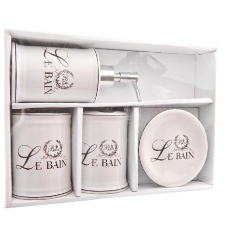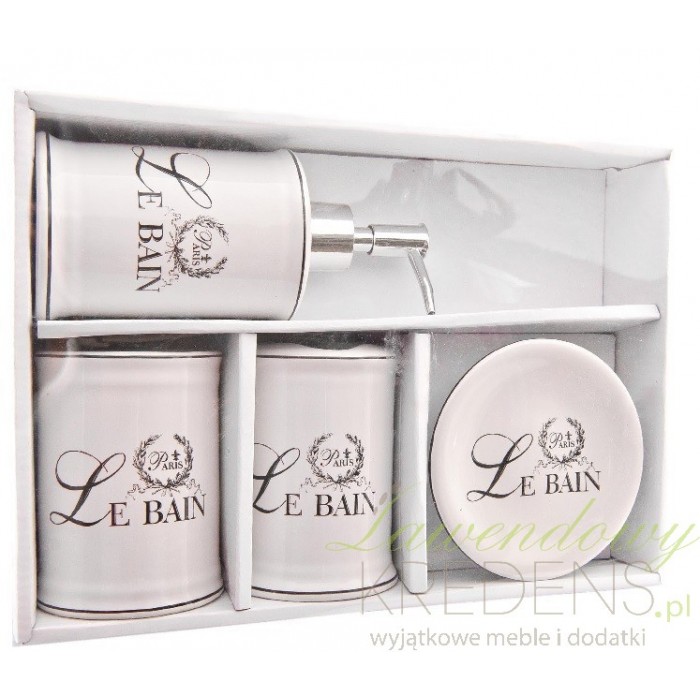 Dodatki w stylu prowansalskim, a wśród nich dodatki do łazienki sprawią ze twoje mieszkanie będzie eleganckie i wytworne i pełne klasy. Zestaw łazienkowy wykonany jest z białej ceramiki z dużym napisem Le Bain oraz wieńcem i napisem Paris. Składa się z mydelniczki, dwóch kubków i dozownika na mydło. Idealny dla dwóch osób.