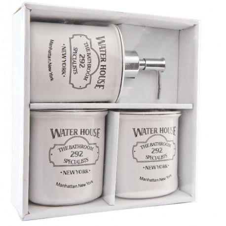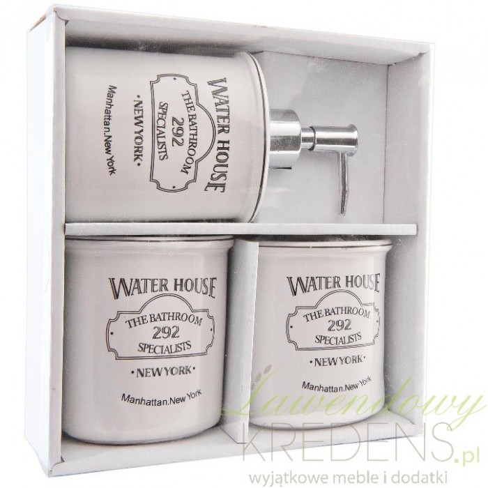 Dodatki do łazienki i zestaw łazienkowy składa się z dwóch kubków i dozownika na mydło. Dodatki w stylu prowansalskim wykonane są z wysokiej klasy ceramiki. Mają biały kolor i srebrne ozdobne napisy w języku angielskim. Świetnie ozdobią twoją łazienkę.