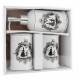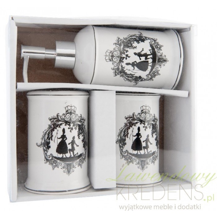 Francuski zestaw łazienkowy z czarną grafiką przedstawiającą damę w sukni i klęczącego mężczyznę.