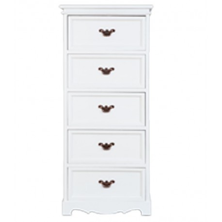 Biała szafka pochodzenia francuskiego wykonana została z białej, trwałej płyty MDF. Szafka prowansalska posiada pięć szuflad z czarnymi oryginalnymi uchwytami, które nadają jej specyficzny klimat. Będzie się niesamowicie prezentować w sypialni, w połączeniu z meblami z tej samej kolekcji. Meble w stylu prowansalskim to wspaniały wybór, który pozostawi niezapomniane wrażenia na długi czas.
