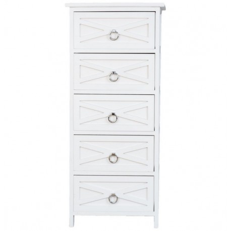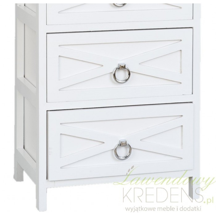 Szafka pochodzenia francuskiego wykonana jest w białym kolorze. Posiada pięć szufladek ze zdobieniami , służącymi jako miejsce na kosmetyki lub bieliznę i okrągłymi uchwytami. Szafka prowansalska będzie się świetnie komponować w łazience lub sypialni wśród białych mebli.Meble w stylu prowansalskim to olśniewające połączenia bogatych zdobień z funkcjonalnością.