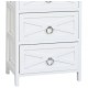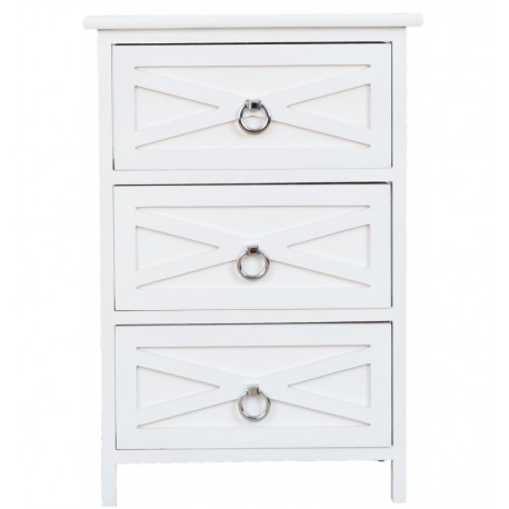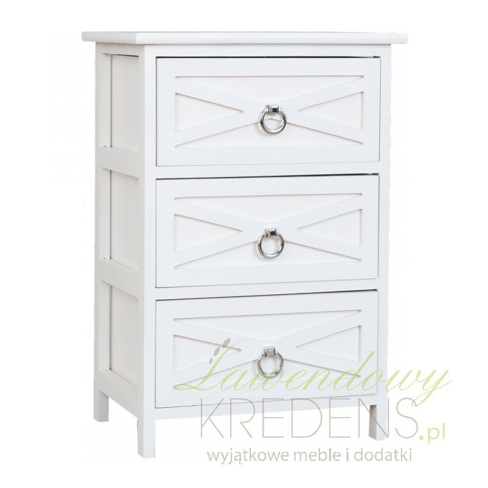 Szafka nocna wyposażona w ładne nóżki została zwieńczona płaskim blacikiem - idealnym do postawienia lampki nocnej, wazonu z kwiatami czy położenia książki. Mebel posiada trzy szuflady z ładnie wyglądającymi uchwytami w kształcie metalowych obręczy, które znajdują się w centrum oraz dekor w postaci cieszącego oko krzyżowania. Postaw na meble w stylu prowansalskim i skompletuj zestaw juz teraz!