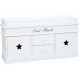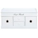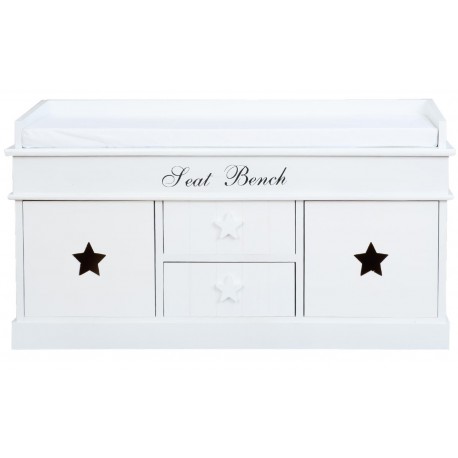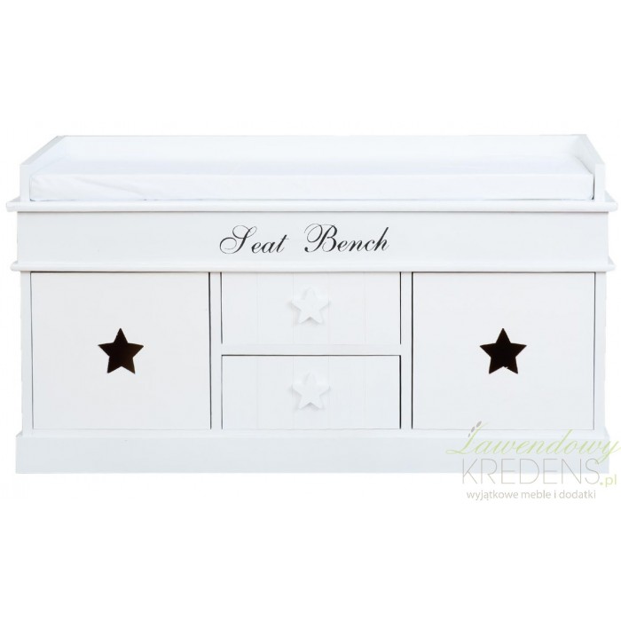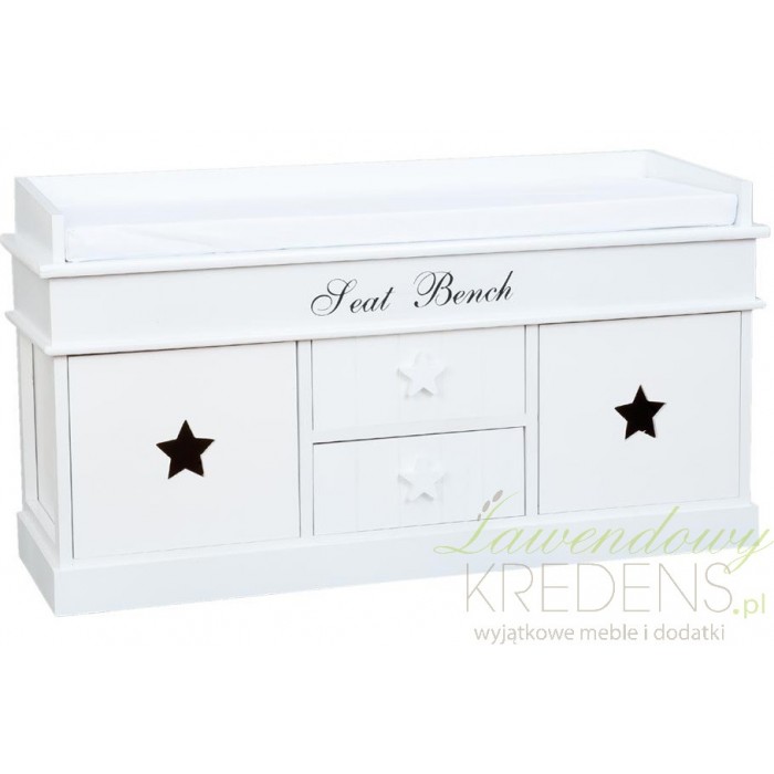 Niska komoda wyposażona w siedzisko z materacem to mebel, który każdy chciałby mieć w swoim przedpokoju. Wygodna i funkcjonalna biała komoda z siedziskiem ma dwie szufladki i dwie szafki. Ozdobiona została białymi i czarnymi gwiazdami oraz napisem Seat Bench. Komoda do siadania to neizastąpiony i funkcjonalny mebel!