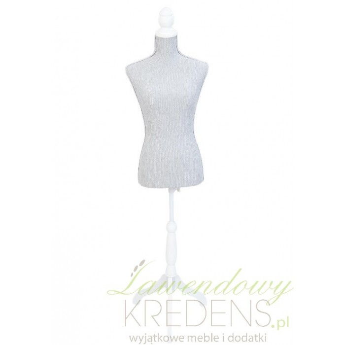 Manekin prowansalski o białym kolorze został udekorowany uroczym paskowaniem i umieszczony na ładnie wyciętym stojaku.
