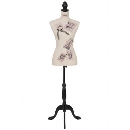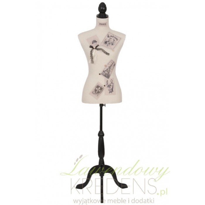 Niesztampowy manekin prowansalski z zabawnymi grafikami i pięknym, czarnym stojakiem. może być Twój już dziś!