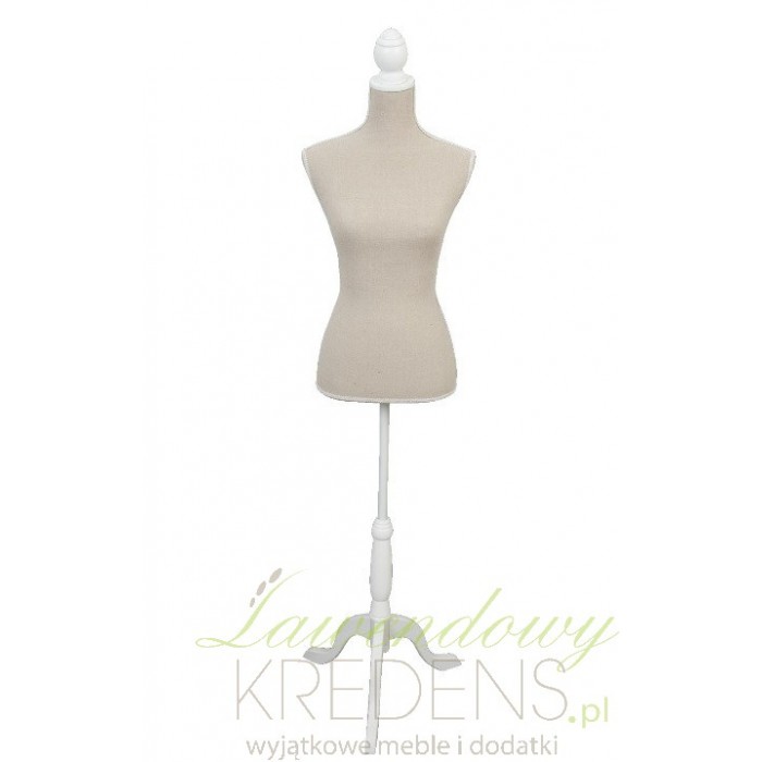 Kształtny manekin prowansalski został ustawiony na stojaku ozdobionym wcięciami i zgrubieniami. Korpus manekina został utrzymany w kolorze beżowym a górna część jest biała. Przedmiot wygląda niezwykle estetycznie i zachęcająco. Wspaniale sprawdzi się jako ozdoba lub wieszak. Dodatki prowansalskie - zobacz inne!