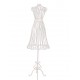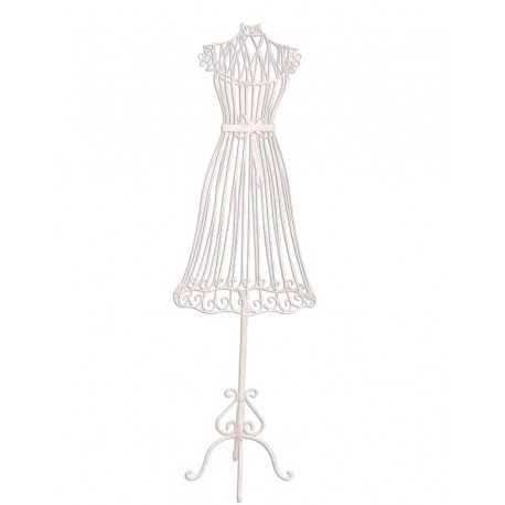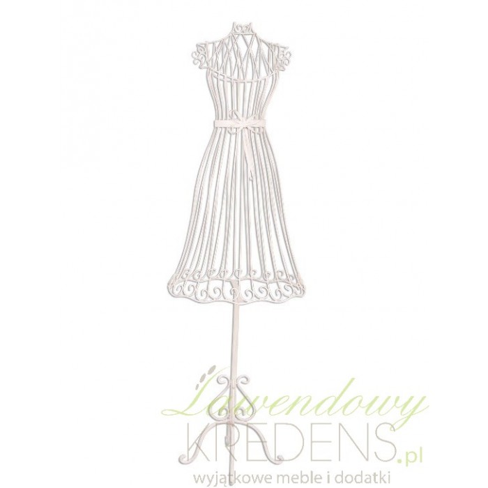 Metalowy manekin ozdobny został pomalowany na biało oraz ustawiony na uroczo udekorowanym stojaku. Część centralną przedmiotu stanowi konstrukcja wykonana na wzór sukienki przepasanej wstążką z kokardką. Manekina możesz używać jako ozdobę lub wieszak na ubrania. Dodatki prowansalskie są cudowne!
