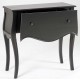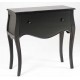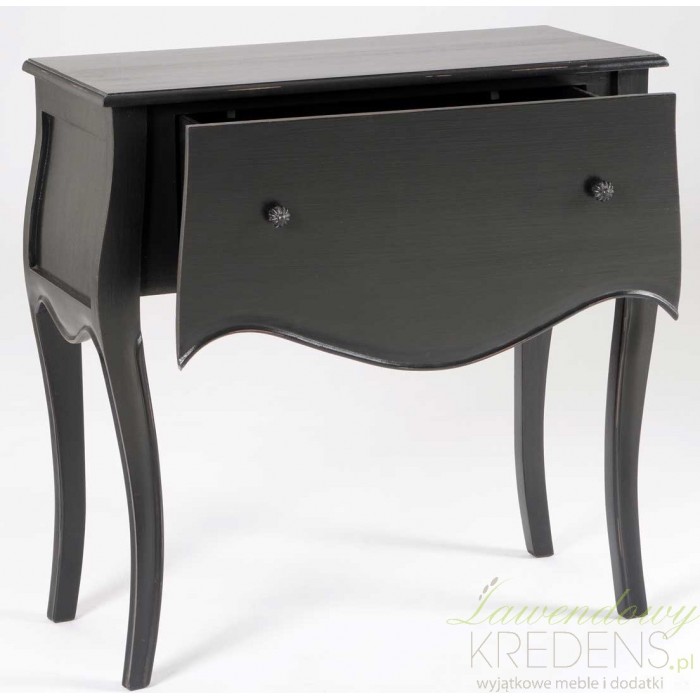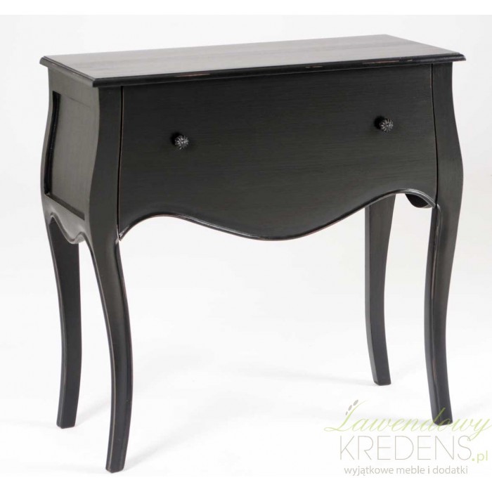Czarna komoda prowansalska z pojedynczą szufladą o dekoracyjnej dolnej krawędzi.