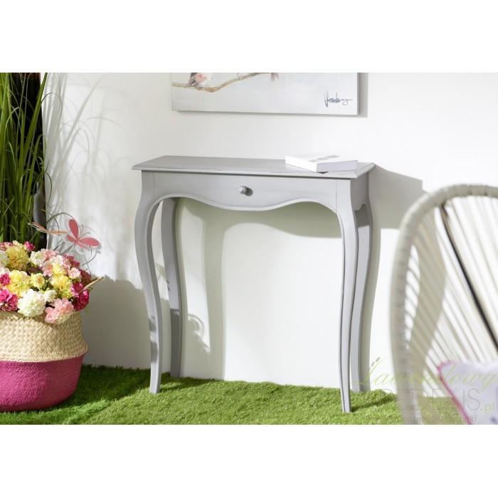 Meble prowansalskie będą wyglądać wspaniale w twoim mieszkaniu. Konsola w stylu prowansalskim pochodzenia francuskiego ma kolor szary z przetartą farbą. Konsola prowansalska z kolekcji Mahoń jest wąska, dzięki czemu idealnie się dopasuje do małych pomieszczeń. Świetnie będzie wyglądać w salonie jako stolik do pracy lub w przedpokoju.