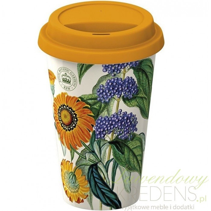 Jeśli lubisz oryginalne, użyteczne a zarazem estetycznie ozdobione przedmioty to kubek podróżny w stylu prowansalskim jest wybitnie przeznaczony dla Ciebie. Ten wyjątkowy produkt wykonano z porcelany i nakryto silikonową, miodową przykrywką. Na ściankach produktu zamieszczono grafikę z kolorowymi roślinami. Przecudowne!